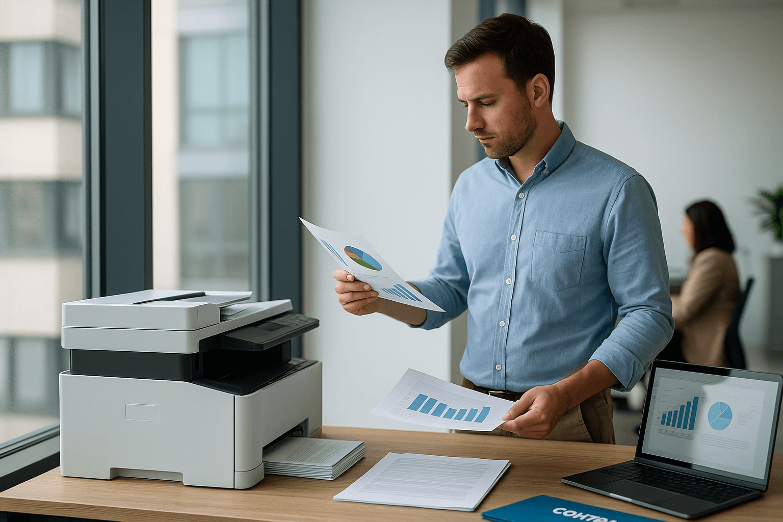La închiriere lucrurile par mai simple. Plătești o taxă lunară, de cele mai multe ori cu un pachet de pagini inclus. Dacă treci de prag, intră în scenă tariful de depășire. Dacă nu-l atingi, tot plătești minimul. Service-ul e, în general, în preț, ceea ce se simte bine. Contractele însă au reguli proprii: perioadă fixă, politici de relocare, tarife diferite pentru alb-negru și color. Confortul există, dar navighezi după busola furnizorului.